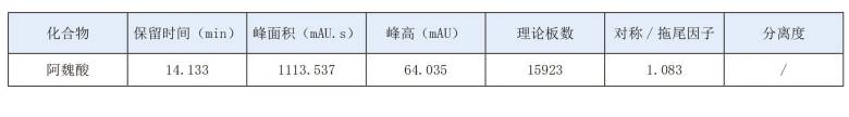 供试品含阿魏酸为0.26%,满足《中国药典》2025版第一部川芎中阿魏酸不得少于0.10%的要求。